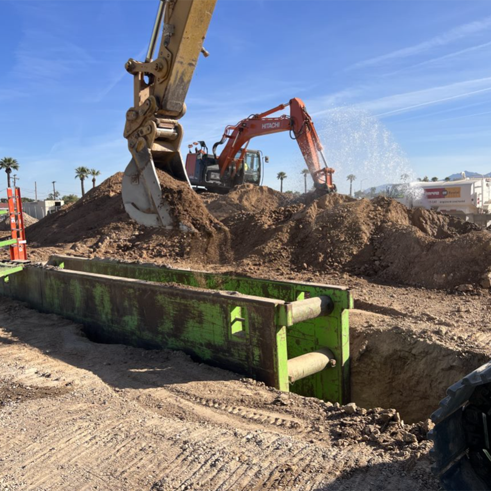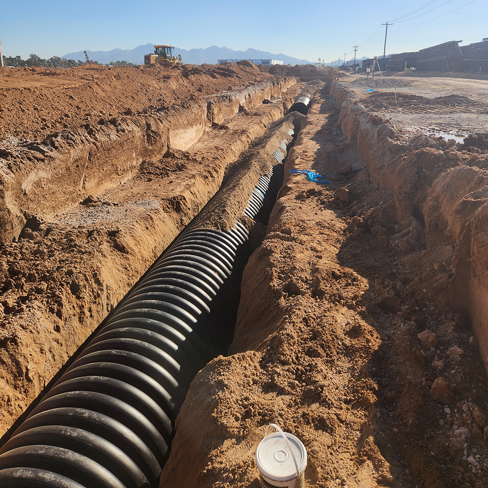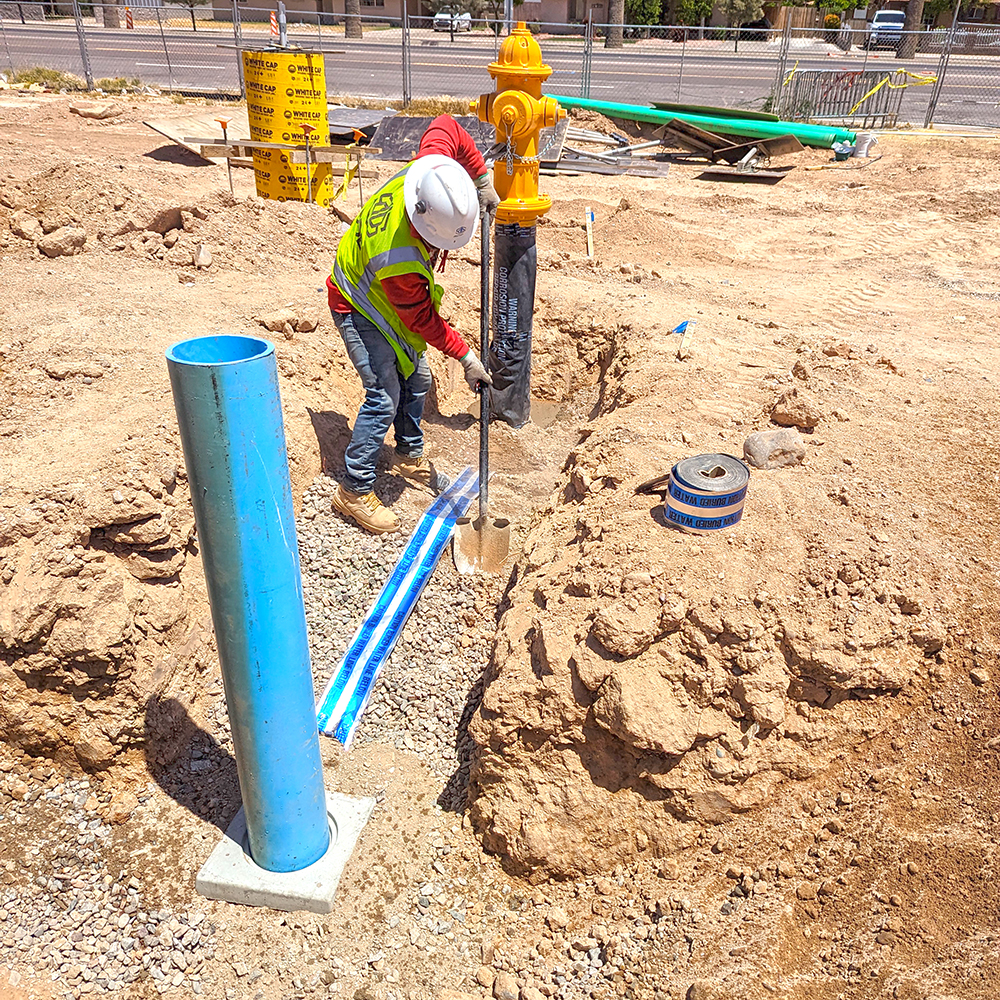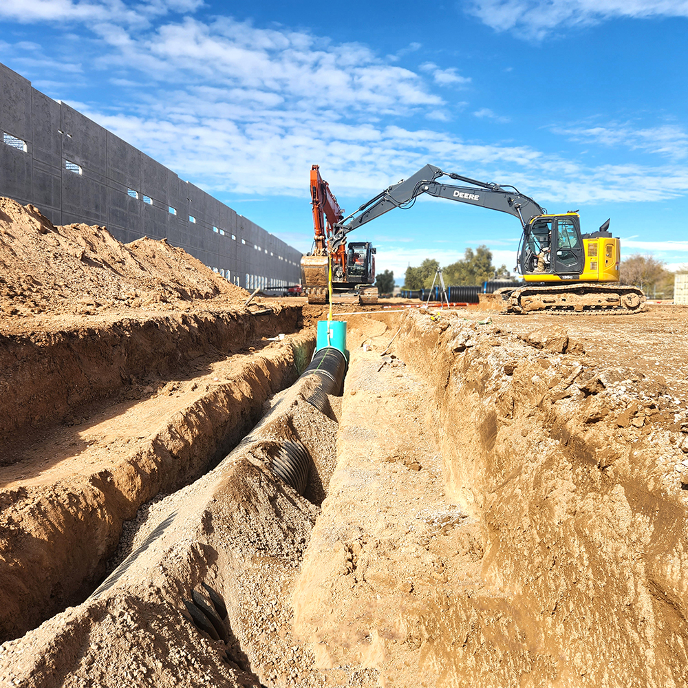 SDB’s civil team completed all offsite and onsite underground wet utilities for the project of ‘JDA Commerce Center’ in Goodyear, AZ. SDB maintained a safe and productive schedule while working on two active five-lane roads to reach existing utilities. Scope included tapping and installing two 10” DIP fire lines across Van Buren Street (400 LF per crossing) to the property and connecting to the existing sewer at two locations on Litchfield Park Rd (400 LF per crossing) to the job site. Once on site, SDB was able to install 8,600’ of 10” DIP fire line, 2,200’ of 8” SDR 35 sewer line, 8,200’ of HDPE storm drain (ranging in size from 12” to 48”) and 29 fire hydrants.